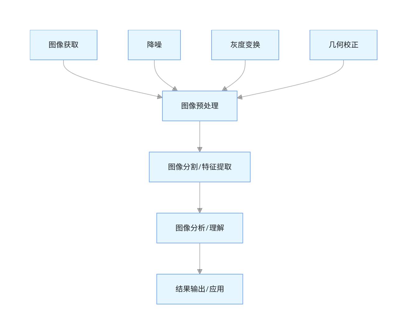 - 核心流程:图像获取→预处理→特征提取→分析理解→结果输出,预处理是提升后续效果的关键;