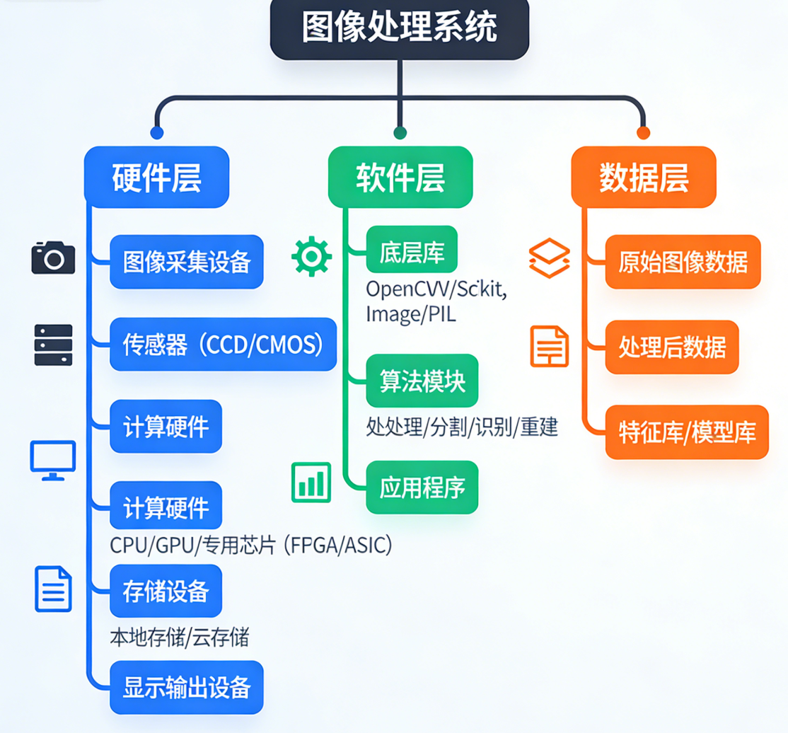 - 系统组成:硬件(采集 / 计算 / 显示)+ 软件(算法 / 库)+ 数据(图像 / 模型)三层架构。