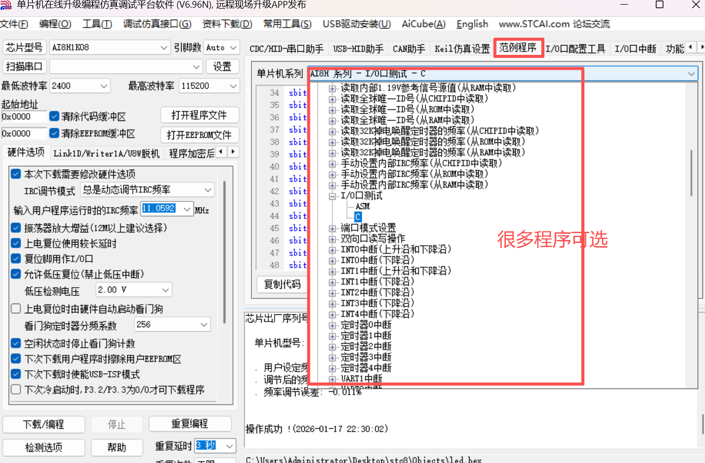 由于我个人使用过,stc89c52单片机,所以流程基本都很清晰。但在查看一些视频操作过程中还是有很多的惊喜。例如ISP软件中居然有参考示例程序,自动添加单片机的头文件等。但核心的操作流程基本没有什么区别。十几年前接触学习的51单片机的软件配套和辅助功能没这么强大,确实大大减少了设计周期。