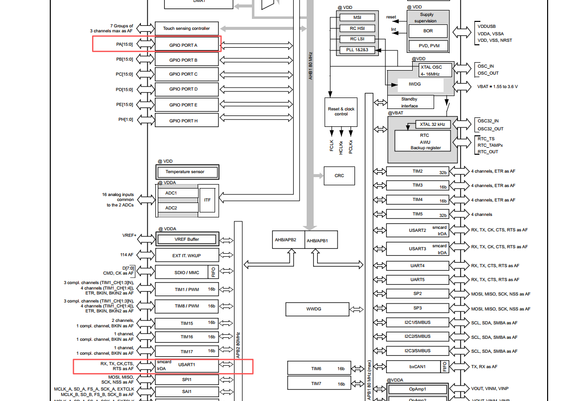 通过系统模块图可知, USART1模块是挂在APB2总线上的一个独立模块, GPIOA是挂在AHB总线上的一个模块, 所以要两个独立使能时钟.