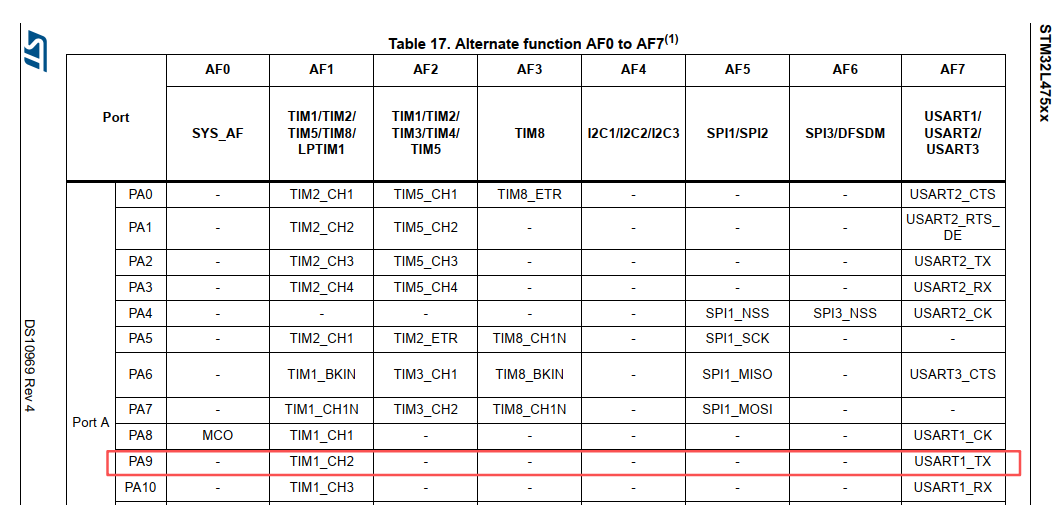 复用功能对应的功能编号如下, 配置为AF7即代表串口USART1_TX功能