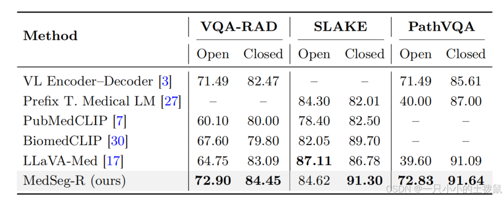生物医学 VQA 任务上与最先进方法的比较 我们在三个广泛使用的生物医学 VQA 数据集上评估了我们的模型,数据集详情总结在表 2 中。对于封闭式问题,我们报告准确率作为评估指标,以评估模型正确分类预定义答案的能力。对于开放式问题,我们采用召回率,它衡量了生成响应中出现的真实标记的比例,确保对模型在医学 VQA 中的语言生成能力进行公平评估。结果如表 3 所示。
