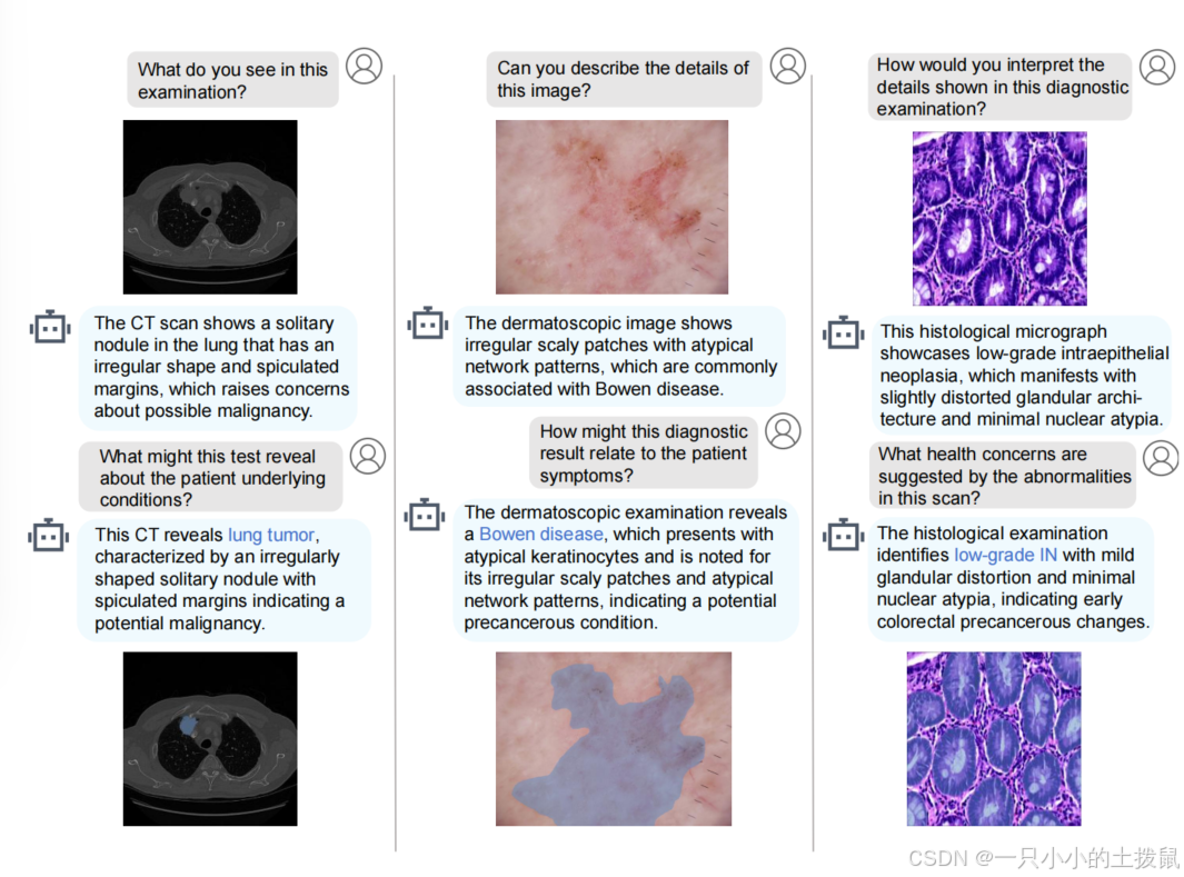 像素级定位一栏突出显示了能够生成分割掩码的模型,而多轮对话则表示支持与用户进行交互式对话的模型。我们提出的模型的独特之处在于,它在端到端训练框架中整合了像素级定位和对话能力,从而能够进行更全面、更灵活的医学图像分析。