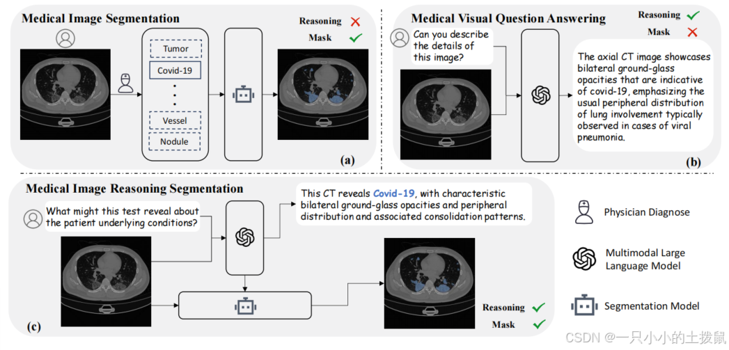 图 1. 医学图像分析中的不同任务。医学图像分割任务(a)严重依赖明确的人工指令来分割所需类别,而医学视觉问答任务缺乏像素级定位能力。我们提出的新任务------医学图像推理分割(c),要求模型同时生成文本响应和相应的分割掩码。