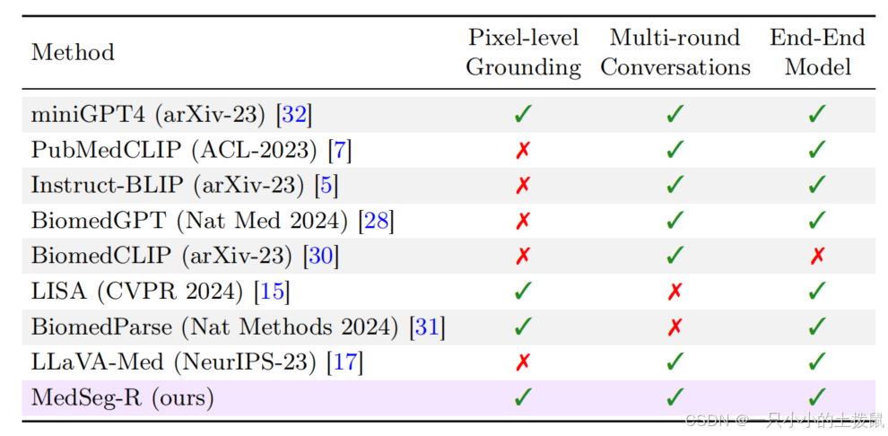 近期,多模态大语言模型(MLLMs) [28,7,31,17,25] 在医学领域的快速发展为研究和开发开辟了新途径。这些模型在理解和处理复杂的视觉 - 语言指令以及利用先进的推理机制来改进下游任务方面表现出卓越的能力。因此,多模态大语言模型在各种视觉 - 语言应用中展现出了显著的性能,包括生物医学视觉问答(VQA)和图像标注(如图 1(b)所示)。然而,如表 1 所示,大多数此类模型旨在生成文本响应,因此缺乏像素级定位能力。尽管已经提出了一些具有推理能力的分割模型,如 LISA [15],但它们仍然主要产生文本响应,例如"当然,它是 [SEG].1 "。这表明,利用多模态大语言模型的推理能力来完成像素级定位任务(如医学图像分割)的潜力在很大程度上仍有待探索。