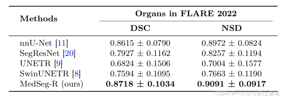 医学图像分割任务上与最先进方法的比较 为了评估我们的模型在医学图像分割中的性能,我们针对医学图像分割竞赛中常用的几种框架进行了比较分析。评估是在 FLARE 2022 数据集上进行的,该数据集包含 13 种不同腹部器官的 CT 扫描图像,使用了两个关键指标:骰子相似度系数(DSC)和归一化表面距离(NSD)。