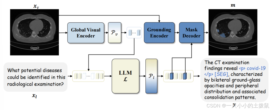 给定来自 GCU 的中间多模态输出 hl,h_l 通过 Pl 进行投影,得到文本响应 y = P_l(h_l)。随后,y 会包含特殊标记 t_{seg},例如 "<p> covid - 19 </p> [SEG] ",这些标记被输入到掩码解码器中,以指导分割掩码 m 的生成。这个过程可以用以下方程概括: