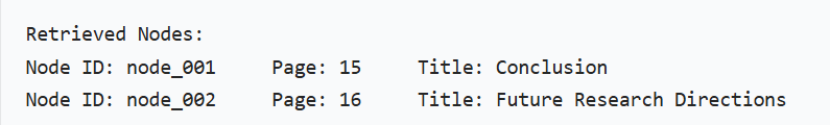 'result'\]:get_tree() 方法的返回值是一个 字典类型(dict),其中包含响应状态、结果数据、元信息等字段,result 字段对应核心的「文档层级树形目录数据」,其余字段可能为 status(响应状态)、message(提示信息)等。 #### 3.2 步骤二:基于推理的树搜索检索 流程:定义查询问题→清理目录树冗余字段→构建结构化 Prompt→异步调用 LLM→获取节点筛选结果→构建节点映射表→解析LLM JSON结果→打印推理过程→遍历打印筛选节点信息。 ##### 3.2.1 使用大语言模型进行树搜索并且识别节点可能包含的相关内容 Query:需求 (1)清理目录树中的冗余 text 字段 tree_without_text = utils.remove_fields(tree.copy(), fields=\['text'\]) 说明: utils.remove_fields(...):模块封装的字段移除工具函数,接收两个核心参数: 第一个参数:需要处理的数据对象(此处为 tree 的拷贝)。 fields=\['text'\]:需要移除的字段列表,此处仅移除 text 字段。 text 字段的特性:原始 tree 中的 text 字段通常存储节点对应的完整文本内容,数据量较大,可能包含大量冗余信息,且本次任务仅需节点 ID、标题、摘要(无需完整文本)。 (2)构建结构化 LLM 提示词   (3)异步调用 LLM 并获取节点筛选结果 tree_search_result = await call_llm(search_prompt) ##### 3.2.2 解析 LLM 节点筛选结果和推理过程 (1)构建文档节点映射表 node_map = utils.create_node_mapping(tree) 说明: utils.create_node_mapping():utils 模块封装的节点映射构建函数,核心逻辑是遍历原始 tree 中的所有层级节点,以节点的 node_id 作为字典的 key,以节点的完整信息(包含 node_id、page_index、title、summary、text 等字段)作为字典的 value,最终返回一个扁平的映射字典(而非嵌套结构) (2)解析 LLM 返回的 JSON 格式字符串结果 json.loads():将JSON 格式字符串转换为 Python 可操作的字典 / 列表对象(与前文 json.dumps() 功能相反,dumps() 是将 Python 对象转为 JSON 字符串,loads() 是将 JSON 字符串转为 Python 对象)。 tree_search_result:前文 await call_llm(search_prompt) 获取的返回值,是 LLM 输出的 JSON 格式字符串,符合预设的 {"thinking": "...", "node_list": \[...\]} 结构。 (3)打印 LLM 推理过程 utils.print_wrapped(tree_search_result_json\['thinking'\]) 搜索提示词的输出为:字典格式,内容为:推理过程+相关节点序号 说明: utils.print_wrapped():utils 模块封装的文本格式化打印函数,核心作用是对长文本进行自动换行处理(按终端宽度拆分),避免长文本超出终端窗口导致换行混乱,同时可能包含文本缩进、换行符优化等功能,提升长文本的可读性。 tree_search_result_json\['thinking'\]:提取解析后字典中的 thinking 字段值 (4)打印筛选出的有效节点信息,并结构化展示 node = node_map\[node_id