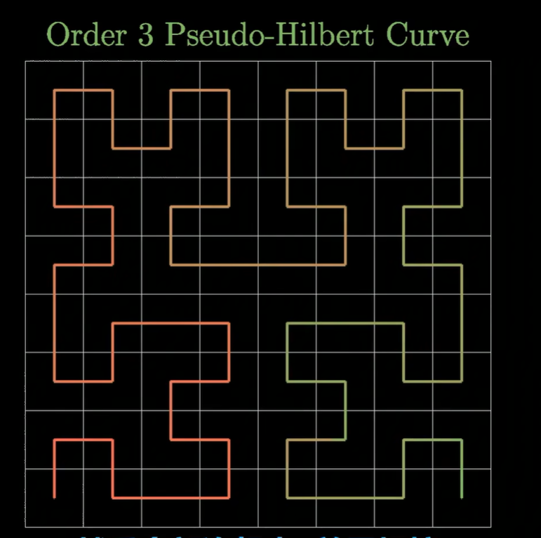 希尔伯特曲线是一个分型曲线,也就是递归定义的,每一阶都把空间划分成四个区域,然后每个区域内也是一个希尔伯特曲线,三阶段大概长这样, d d d阶的希尔伯特曲线,可以填充 2 d ∗ 2 d 2^d*2^d 2d∗2d的平面
