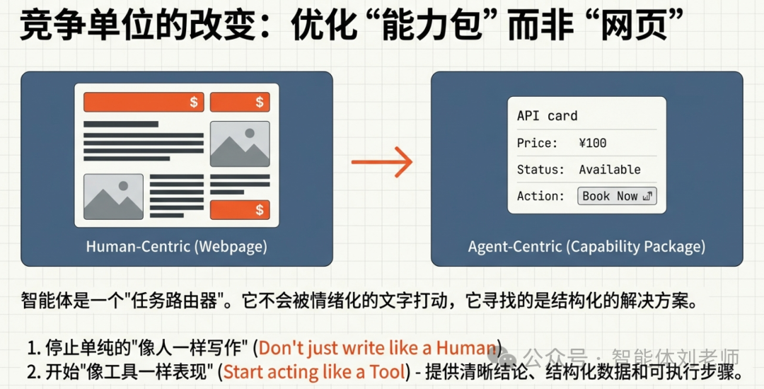 这时候企业竞争的单位就变了。过去你优化的是网页,现在你要优化的是"能力包"------你能提供什么、适用什么场景、能不能稳定交付、能不能被调用、出错如何处理、结果如何验证。