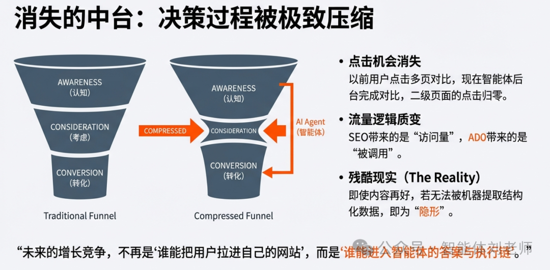第三,流量的归属从"展示"变成"采用"。SEO带来的是访问量;ADO带来的可能是"被引用、被调用、被推荐",甚至用户根本没访问你的站点,交易就发生在智能体链路里。