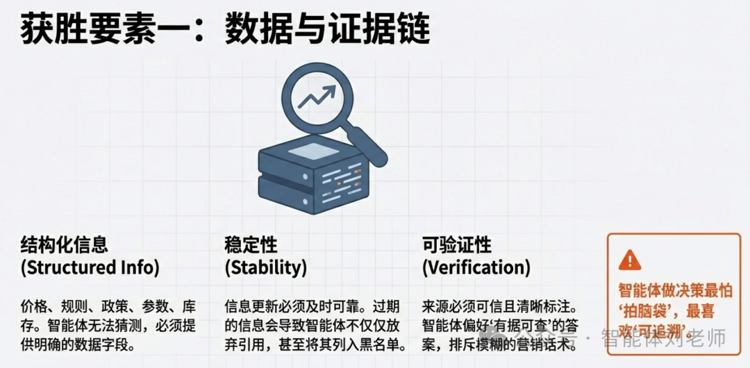 第二,信息的颗粒度在变化。网页是面向人类阅读的,智能体更偏好面向机器提取的:清晰结论、结构化数据、可验证来源、可执行步骤。你写得再好,如果智能体提取不到关键变量,也可能被忽略。