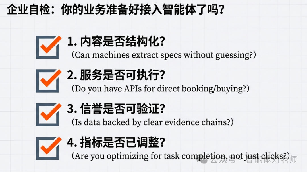 - 流量不再只由搜索引擎分配,而开始由智能体发现引擎分配。