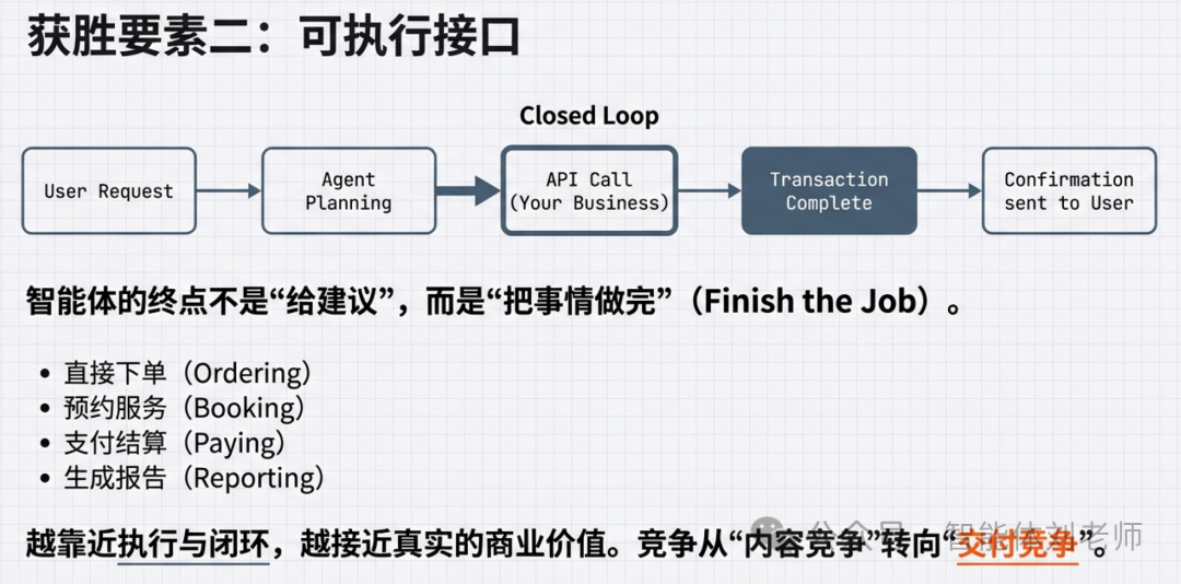 - 另一类是可执行接口强的。能够直接完成动作:下单、预约、支付、生成报告、调用服务。智能体的终点不是"给建议",而是"把事情做完"。越靠近执行与闭环,越接近真实的商业价值。