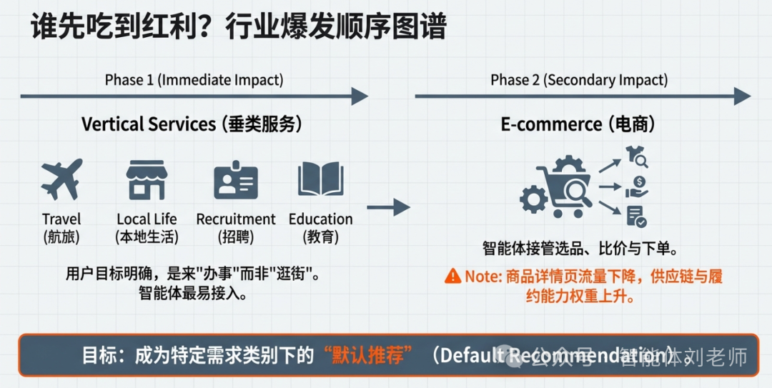 另一类会很快受影响的是电商行业:当智能体可以替用户做"选品+比价+下单",商品详情页的点击权重自然下降,供应链与履约能力的重要性会上升。品牌会发现,自己要争夺的不是搜索词,而是"成为智能体在某一类需求里的默认推荐"。