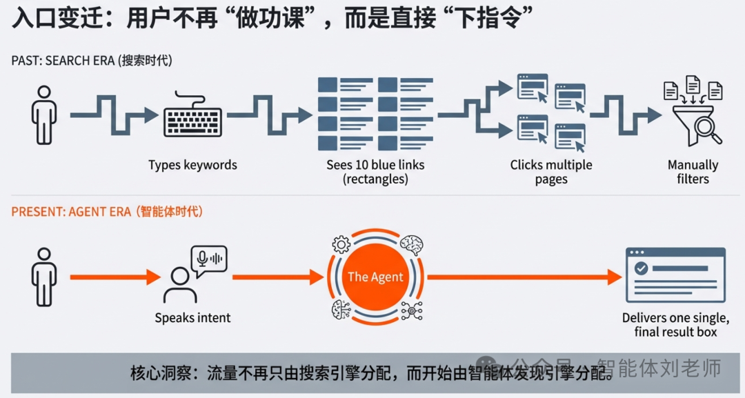 这不是"增长技巧"的升级,而是入口更替后的权力转移:流量分配权从搜索引擎的排序系统,转向智能体的决策与执行系统。