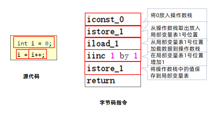 - 其中 iinc 1 by 1 指令指的是 将局部变量表1号位置增加1,其实就实现了i++的操作