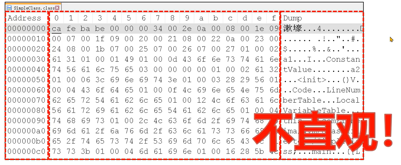 字节码文件中保存了 源代码编译之后的内容,以 二进制的方式 存储,无法直接用记事本打开阅读