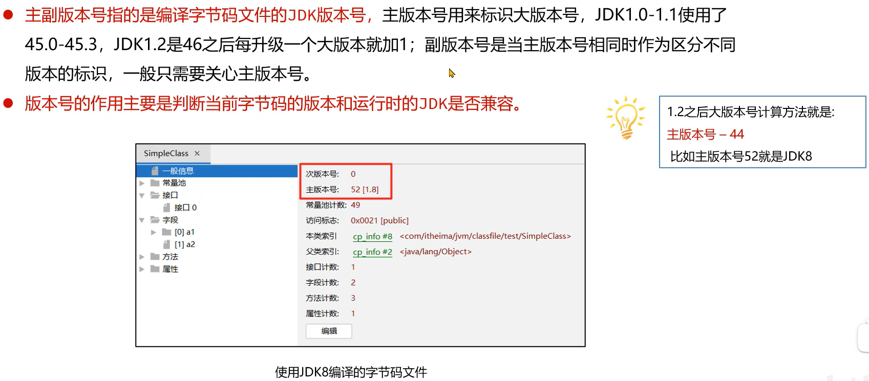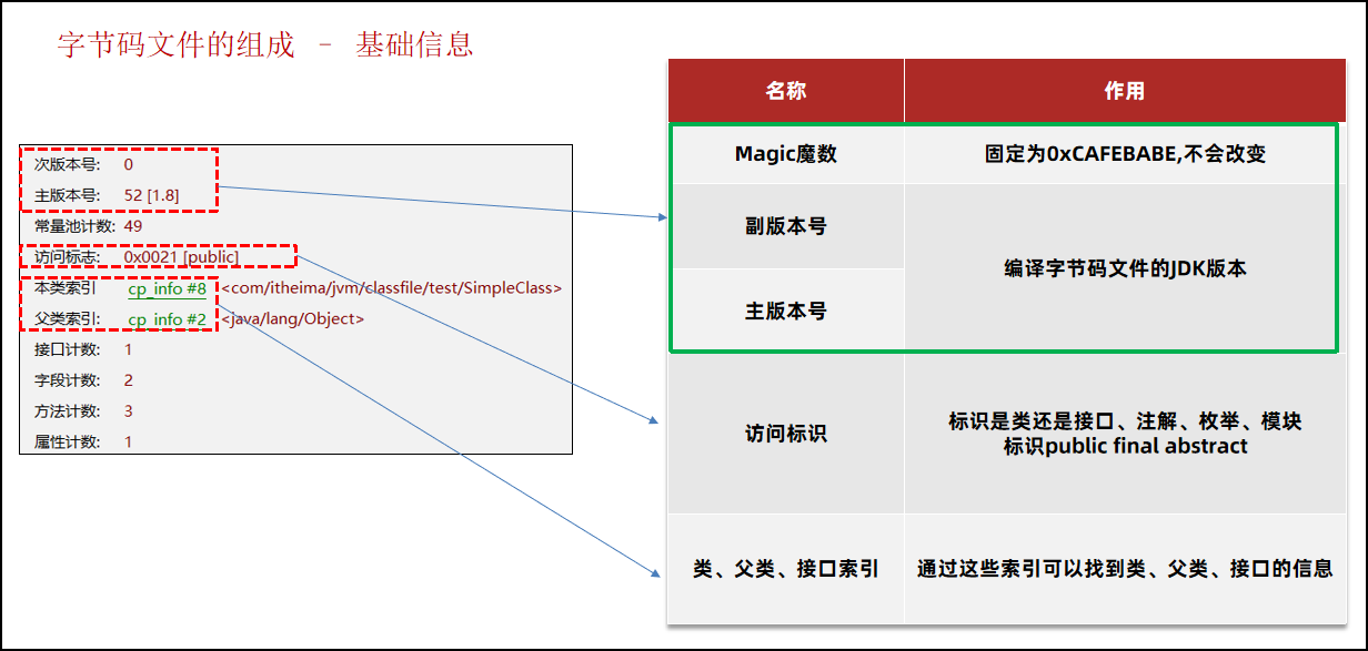 - 基础信息 :魔数、字节码文件对应的 Java版本号、访问标识(public final 等)、父类和接口信息