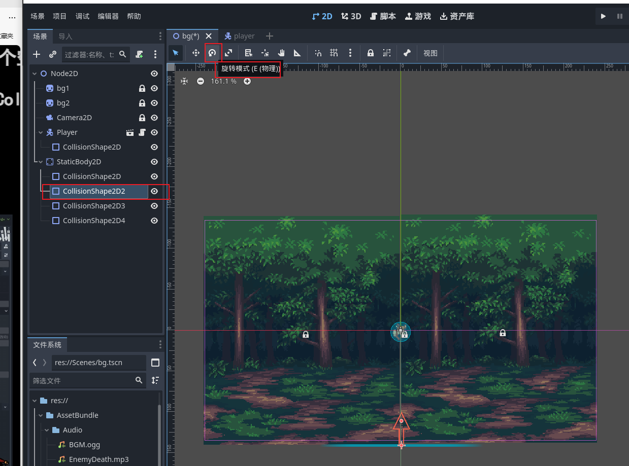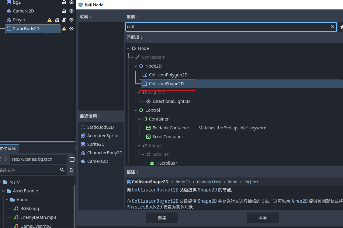 - 选中我们的staticBody2D节点,然后点击添加子节点,然后搜索Collisionshape2D节点进行添加