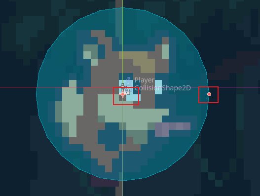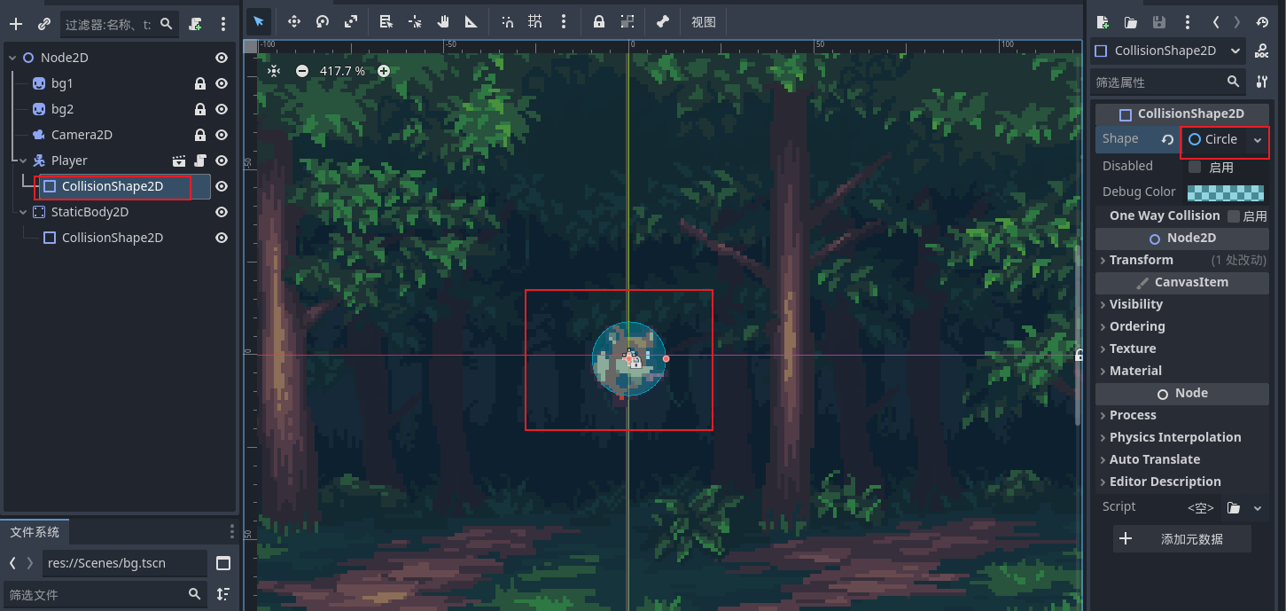 - 所以为了让玩家和这个空气墙碰撞限制,我们也得是加上碰撞体,在这里使用设置了一个圆形作为玩家角色的碰撞体