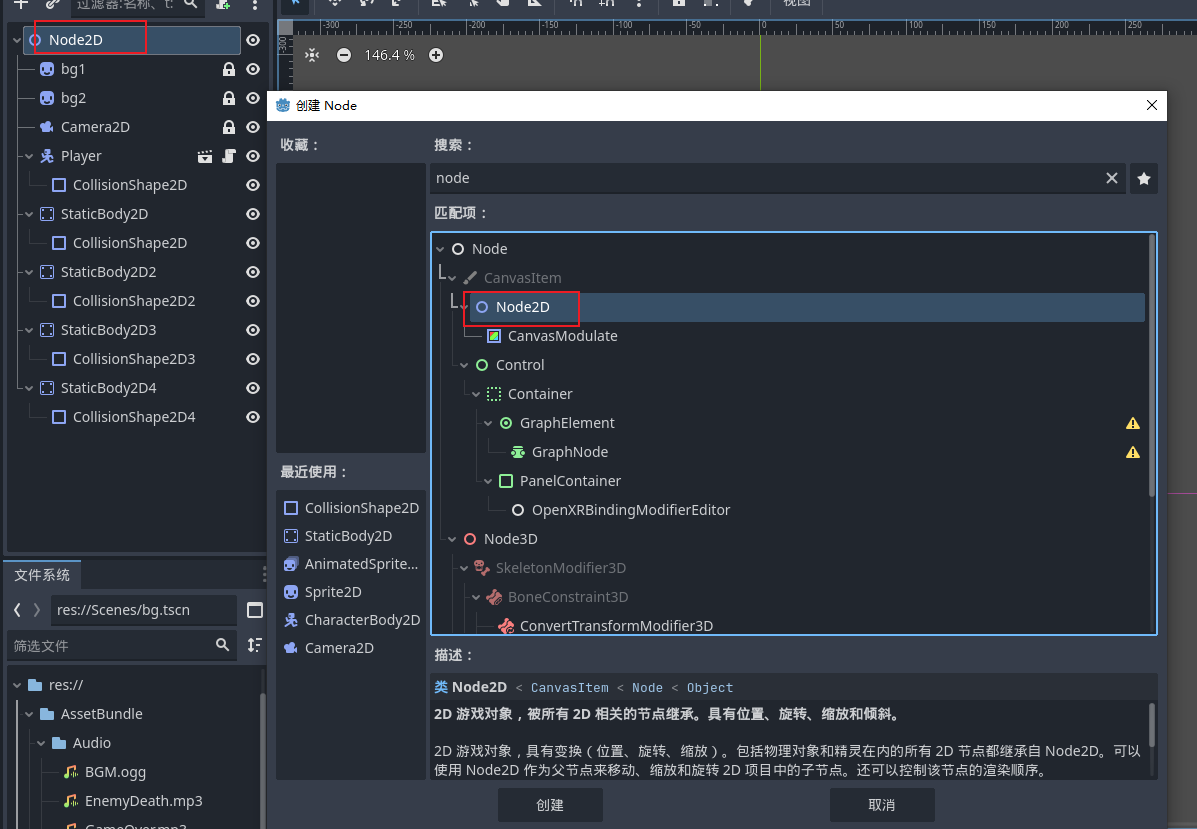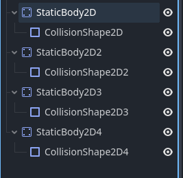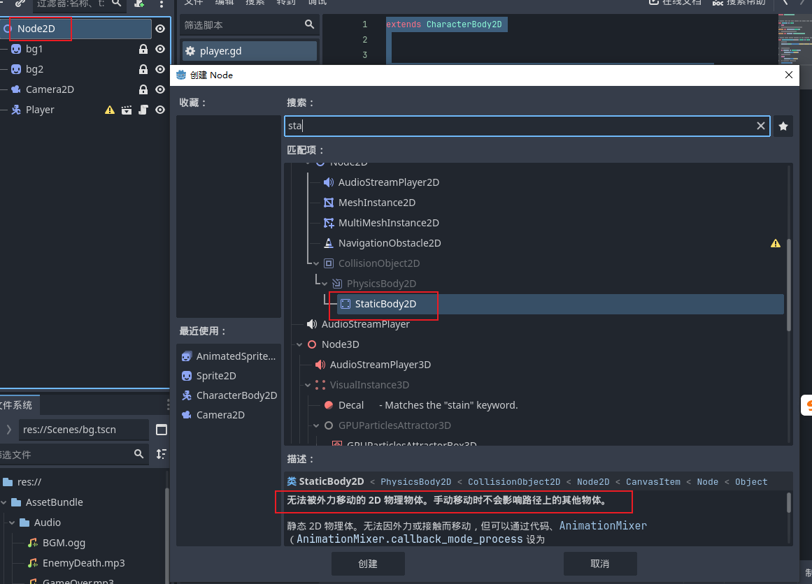 - 回到主场景添加一个新节点,这个节点是staticBody2D(静态物理物体)