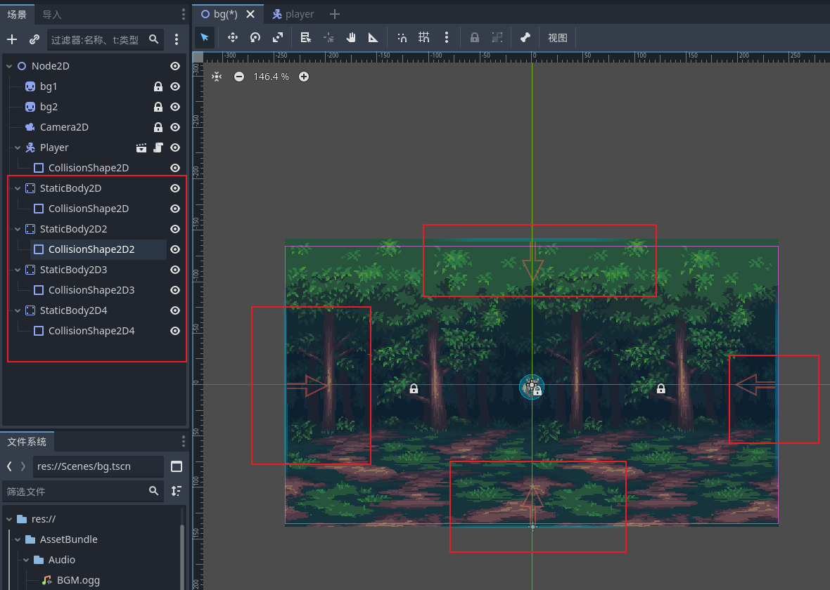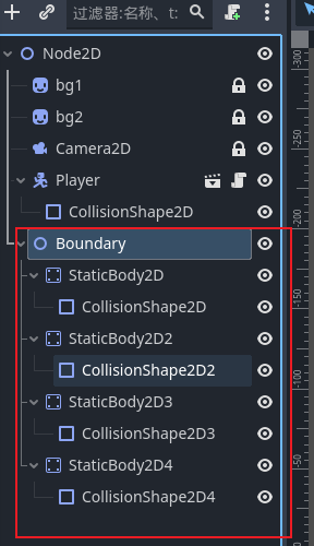 StaticBody2D,并配置 CollisionShape2D,使用 WorldBoundaryShape2D 作为无限延伸的边界墙。同时为玩家角色补充碰撞体,确保与边界产生物理碰撞。通过复制并旋转边界墙,分别设置上下左右四个方向的限制。最后将四面空气墙统一放入一个父节点进行分组管理,重命名并锁定节点,便于后续维护与调整。 -