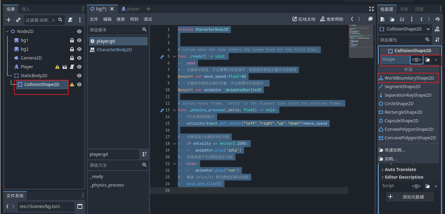 - 然后我们需要给这个碰撞体设置一下形状,选中Collisionshape2D节点,点击右边检查器的shape,我们选择第一个WorldBoundaryshape2D,这个是一个无限延伸的墙,所以很适合做空气墙