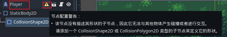 - 另外玩家角色也是需要设置一个碰撞体,正如我们之前一直没有进行设置所以,在玩家节点会有一个三角形的警告
