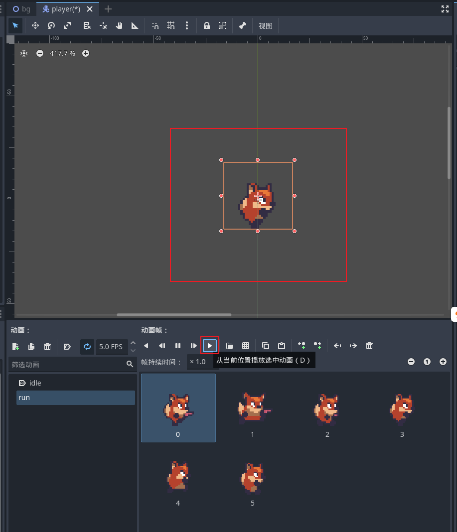 - 添加完成之后,可以点击上面的播放按钮,进行预览小狐狸跑动起来的效果,这里初始5帧循环播放有点快所以设置为12帧播放(这里没播放预览还是代码界面是因为(O_o)??需要切换为2d界面)