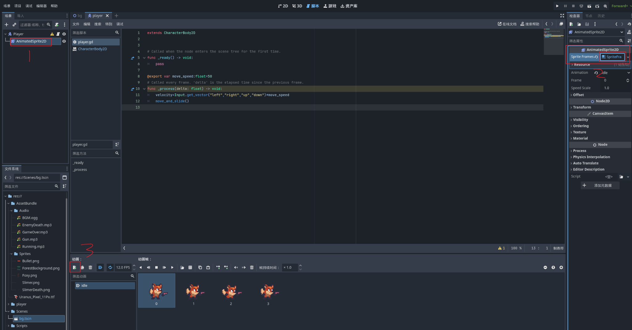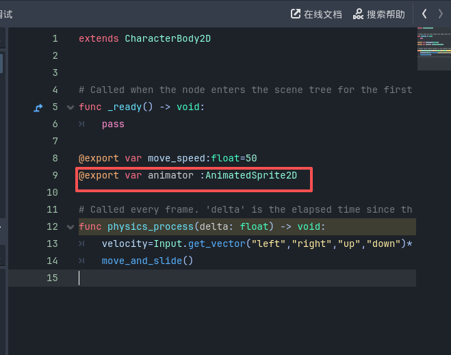 - 然后为了控制玩家的动画变化,比如从待机动画切换到跑步动画,我们需要进行获取一下玩家animated sprite2D节点就是玩家的精灵节点。我们用一个变量去进行存储它