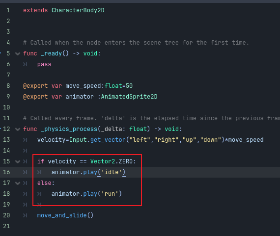 - 只有玩家移速为0的时候,我们才进行播放待机动画,玩家移动起来的时候我们需要播放跑步动画,所以我们需要使用一下if语句进行判断