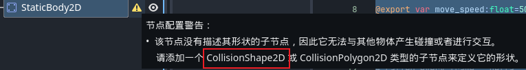 - 添加完成之后会显示一个警告,说缺少一个节点Collisionshape2D节点,这个节点是一个2d碰撞形状