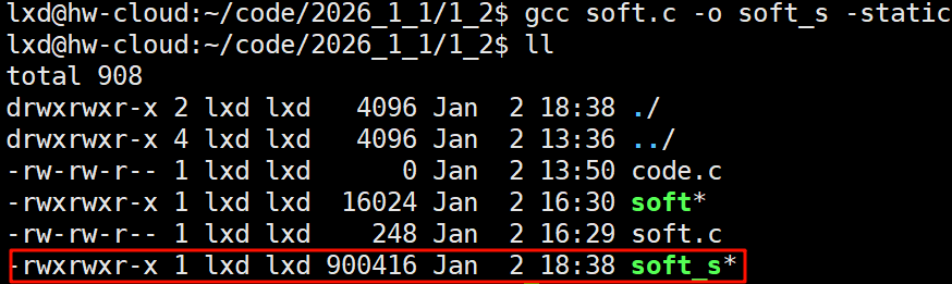 加一个**-static:** gcc soft.c -o soft_s -static