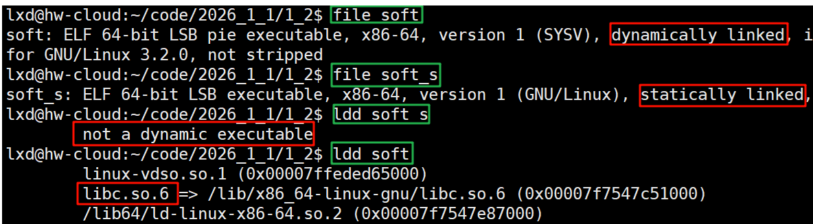 查看动态链接和静态链接生成的可执行程序的详细信息和它们所依赖的库信息: