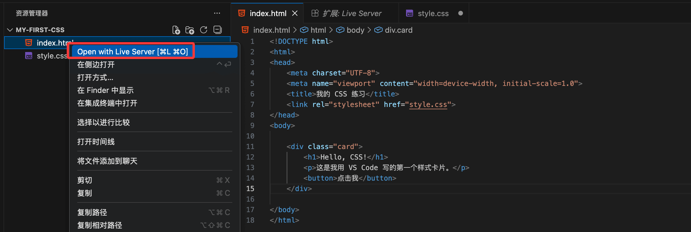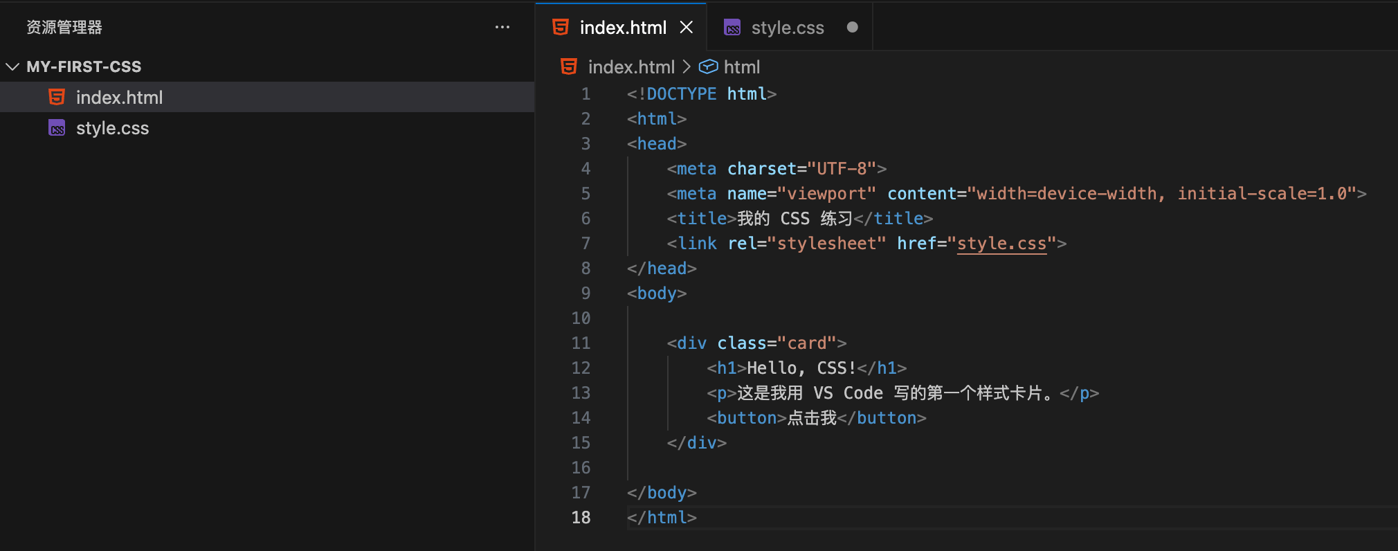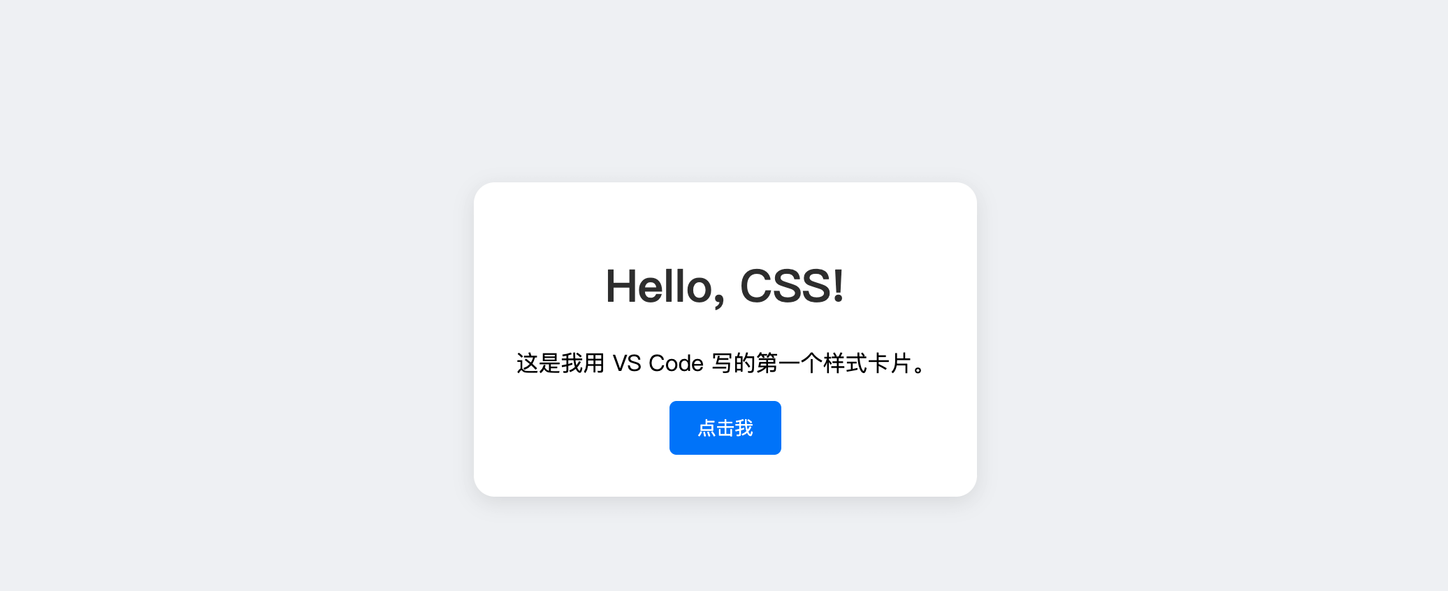 <!DOCTYPE html> <html> <head> <meta charset="UTF-8"> <meta name="viewport" content="width=device-width, initial-scale=1.0"> <title>我的 CSS 练习</title> <link rel="stylesheet" href="style.css"> </head> <body> <div class="card"> <h1>Hello, CSS!</h1> <p>这是我用 VS Code 写的第一个样式卡片。</p> <button>点击我</button> </div> </body> </html>