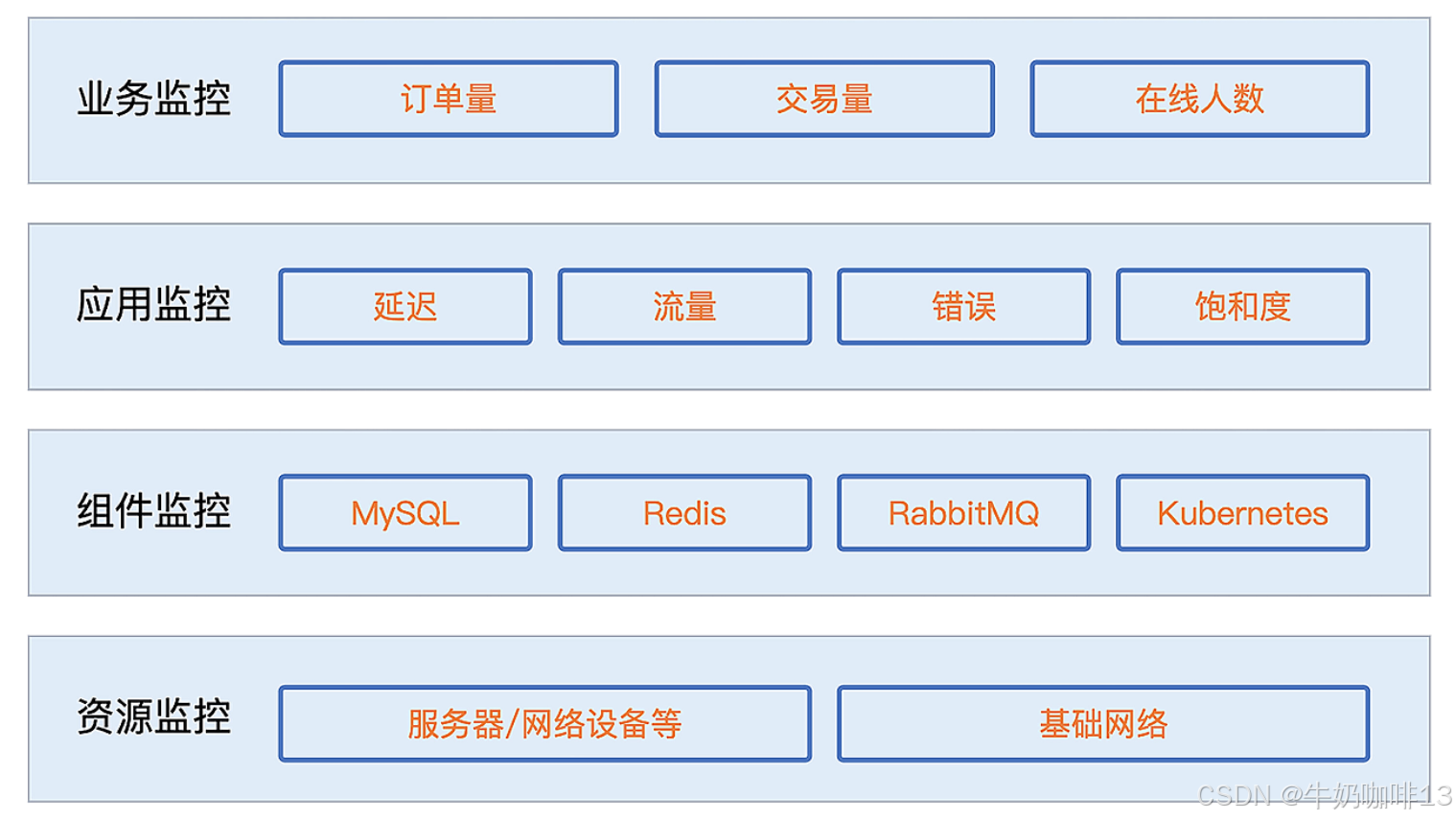 | 1 | 业务监控 | 这类监控指标非常重要,它代表着业务系统是否正常,同时也是管理层非常关注的,因为业务系统代表企业营收或者直接与客户项目相关。 核心业务指标异常,一定是故障,业务指标异常代表着最终用户体验受损,或者造成公司直接资产损失。 |