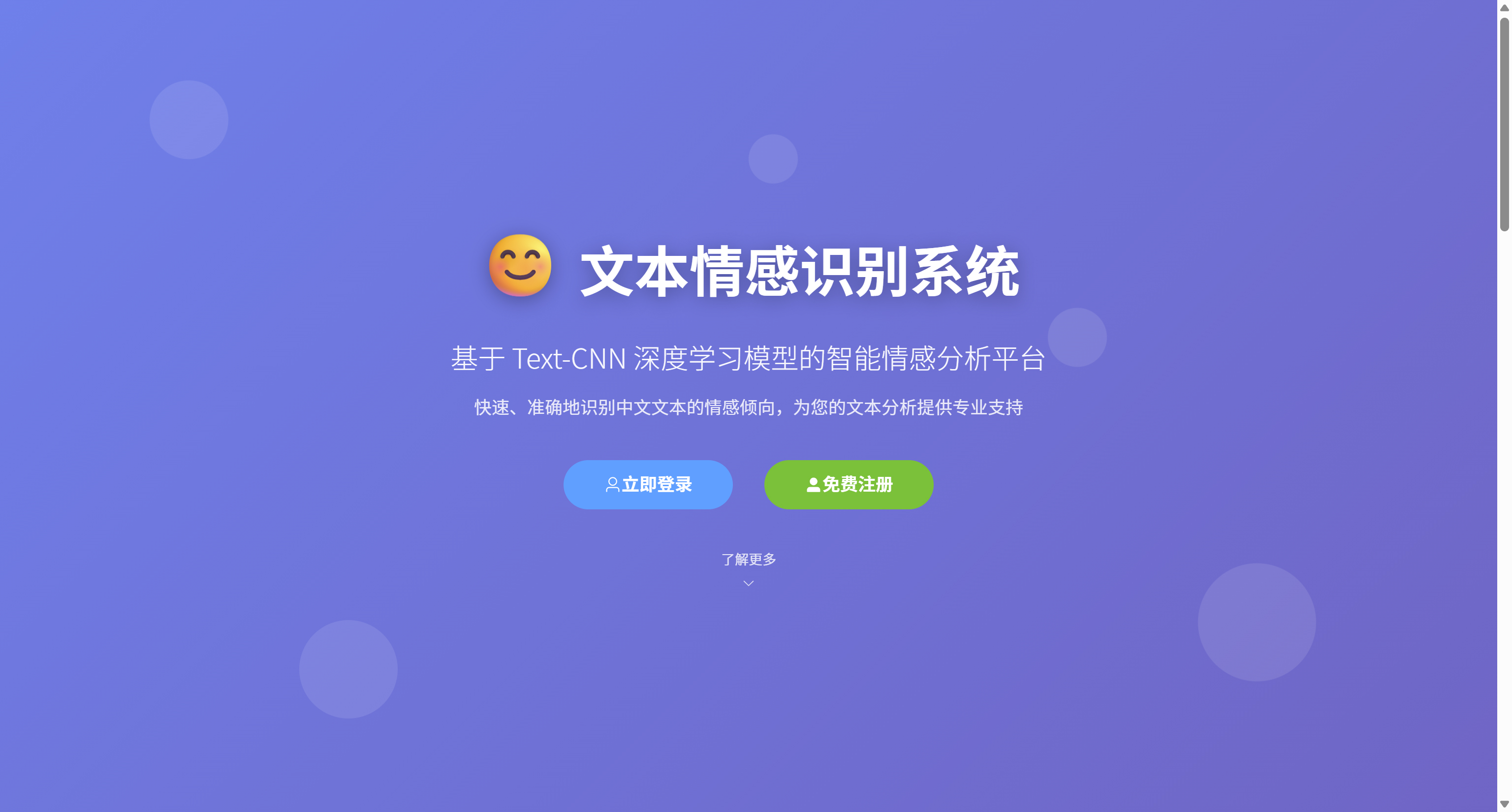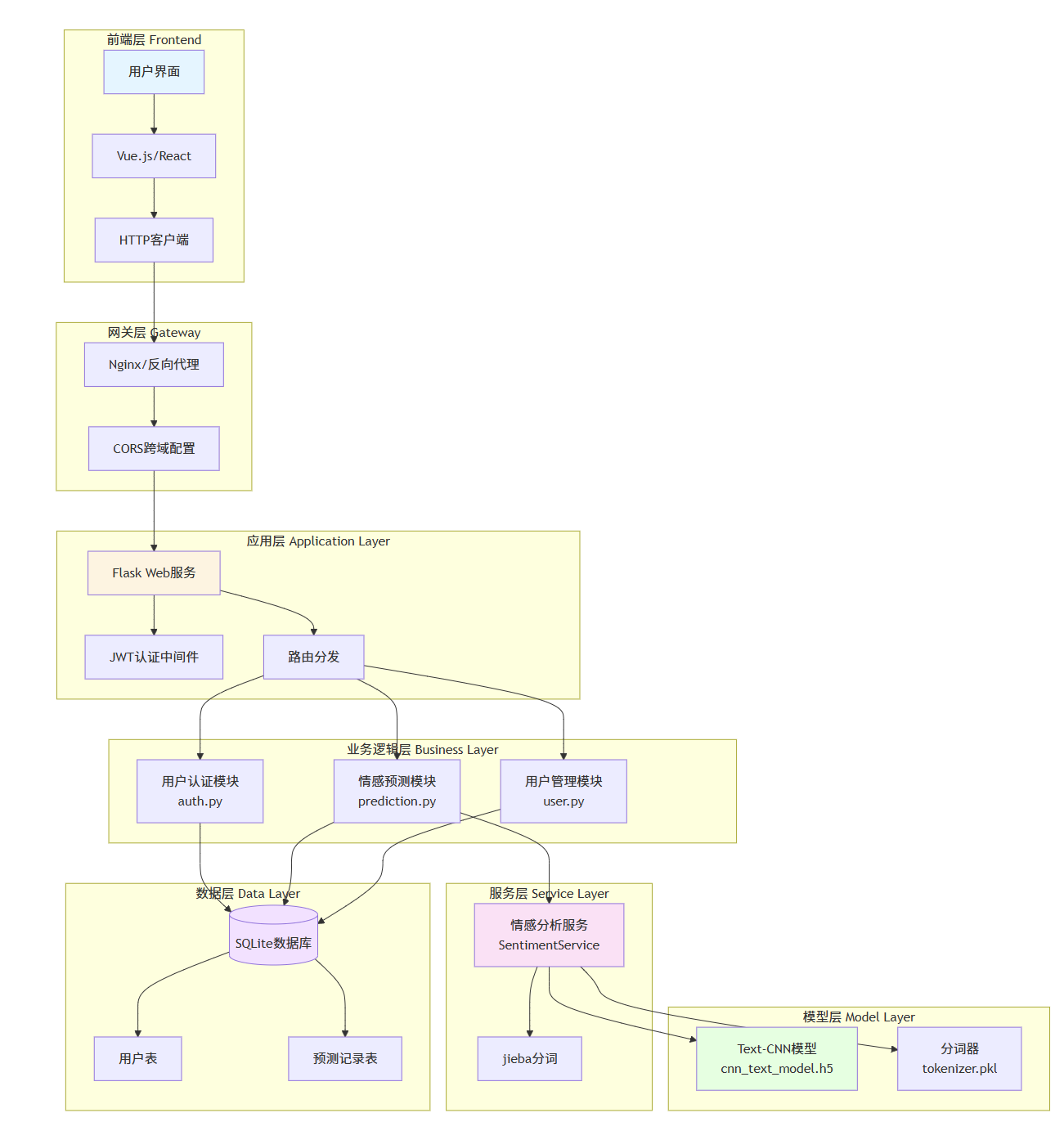 本项目是一个基于Text-CNN深度学习模型的中文文本情感识别Web应用系统。系统采用前后端分离架构,后端使用Flask框架构建RESTful API,深度学习模型采用TensorFlow/Keras实现的Text-CNN卷积神经网络,前端框架支持跨平台访问。