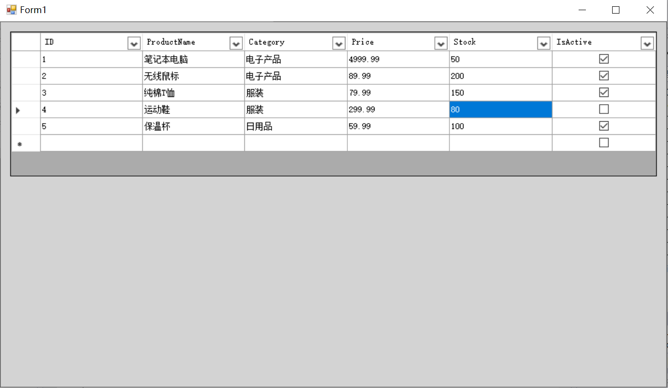 dt.Rows.Add(4, "运动鞋", "服装", 299.99, 80, false);