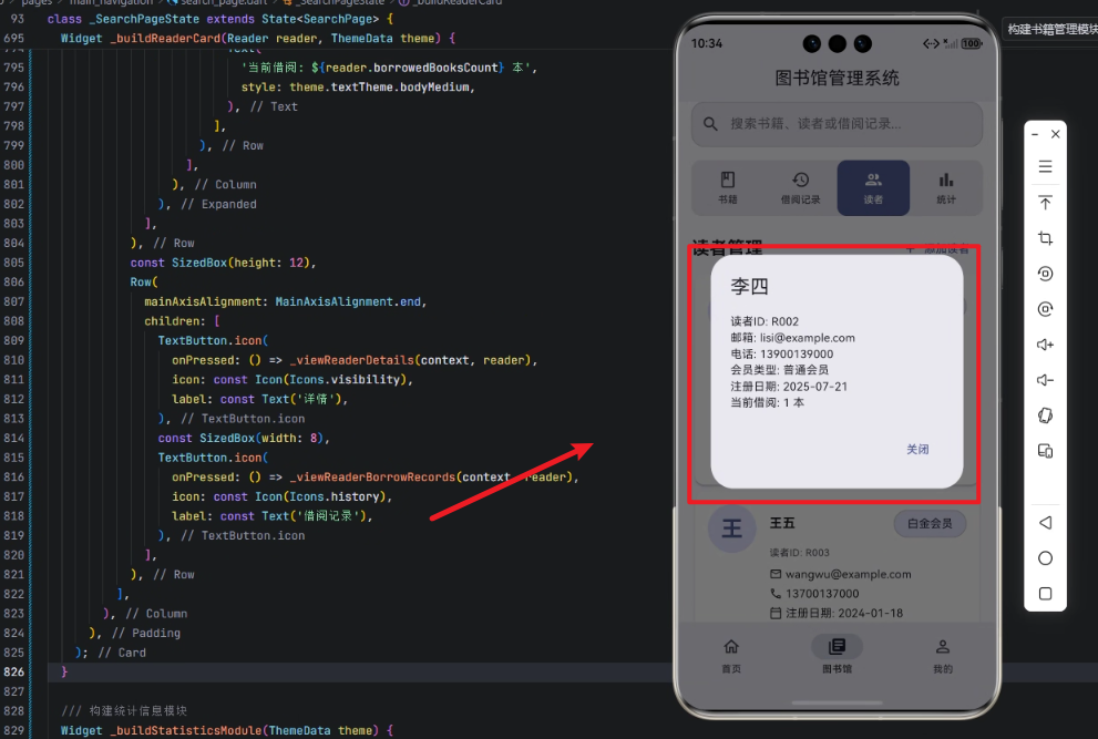 Row + Expanded + Column组合,将姓名、会员类型、ID、联系方式、注册日期和借阅数量分区布局,保证信息清晰可读。 -