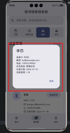 - 用户信息展示:姓名、会员类型、联系方式、借阅状态等。