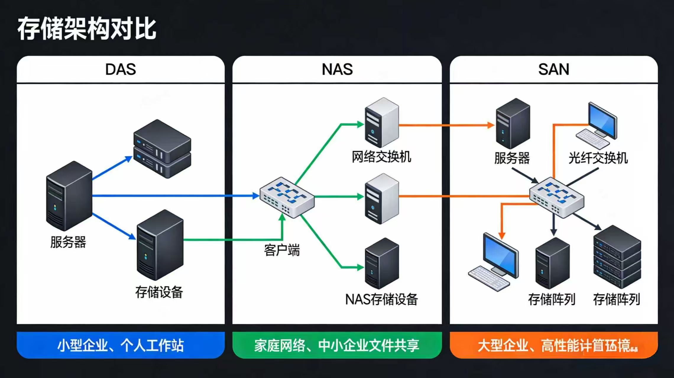 从存储架构来看,主流方案分为三类:DAS(直连附属存储)简单易用,适合小型场景,但无法实现资源共享;NAS(网络附属存储)通过LAN实现跨平台文件共享,成本经济,广泛应用于FTP服务、医疗影像存储等场景;SAN(存储区域网络)则主打高可靠性,分为IP SAN与FC SAN两类,前者扩展性好、可利旧现有设备,后者性能更优,适合企业核心业务,但部署成本较高。此外,根据服务类型,存储还可分为块级(高性能、低延迟,适配数据库等核心业务)、文件级(适合共享场景)与对象级(适配大容量静态数据,如备份、音视频存储)三类。