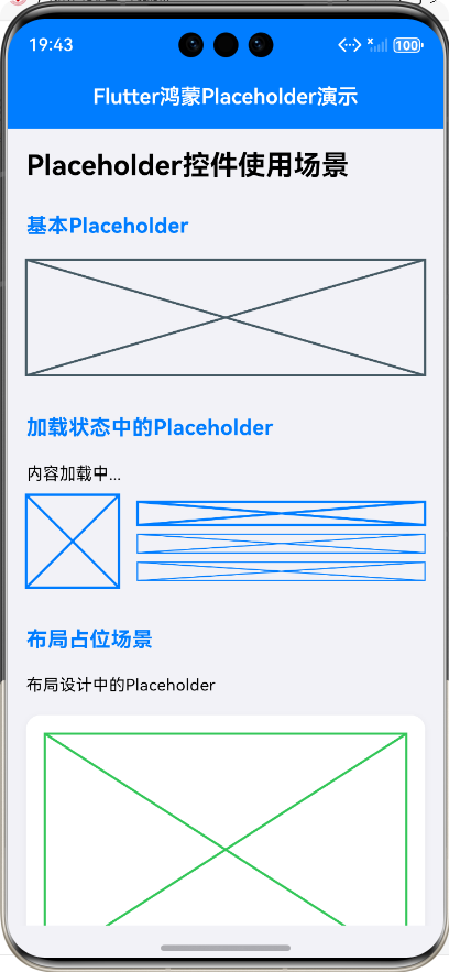 Placeholder控件是Flutter中的一个基础UI组件,用于在内容加载过程中或布局设计阶段显示占位效果。它可以显示一个带有斜向条纹的矩形区域,用于表示该位置将在后续显示实际内容。