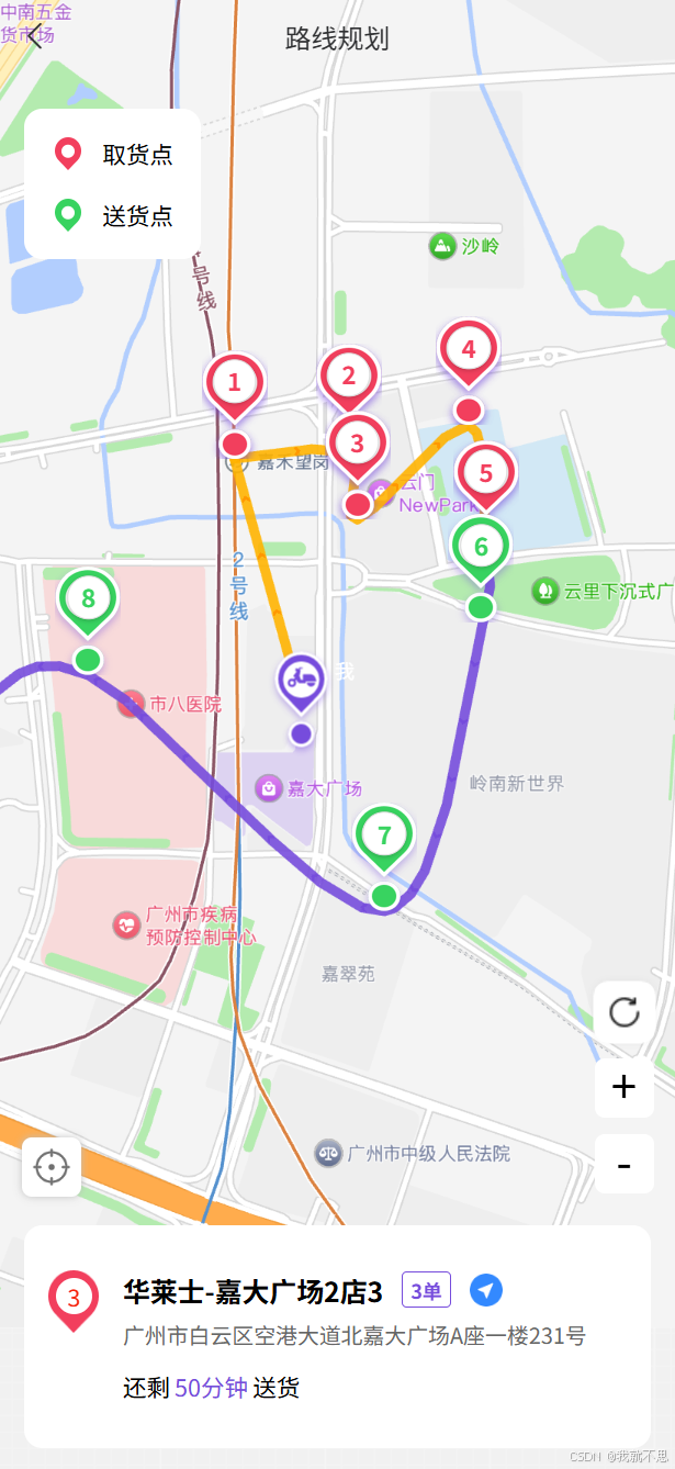 { index: 3, lng: 113.291401, lat: 23.236478, type: 'pickup', orderData:{name:"华莱士-嘉大广场2店3",address:"广州市白云区空港大道北嘉大广场A座一楼231号",num:3,time:50} }, // 橙色3
