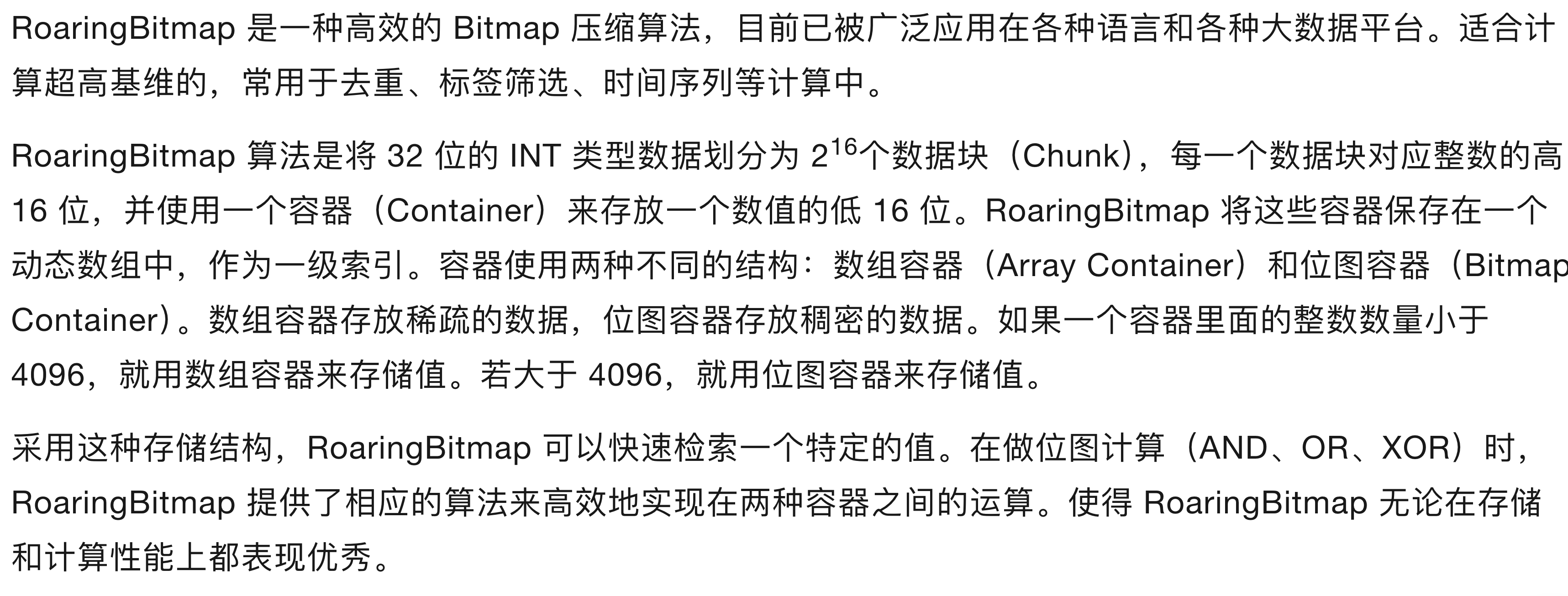 - Bitmap Container:64KB大小与CPU缓存行对齐