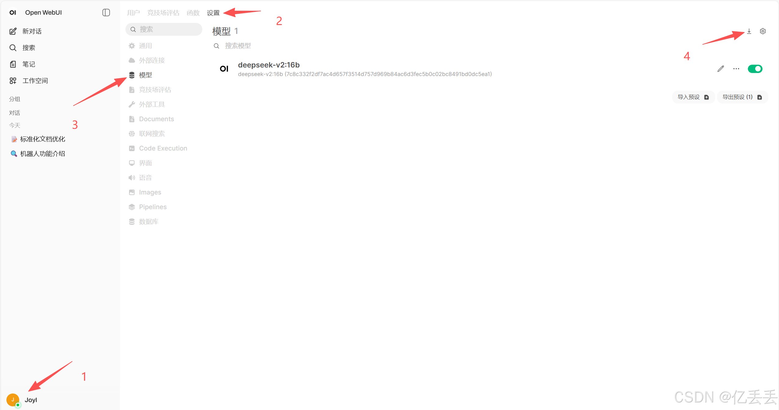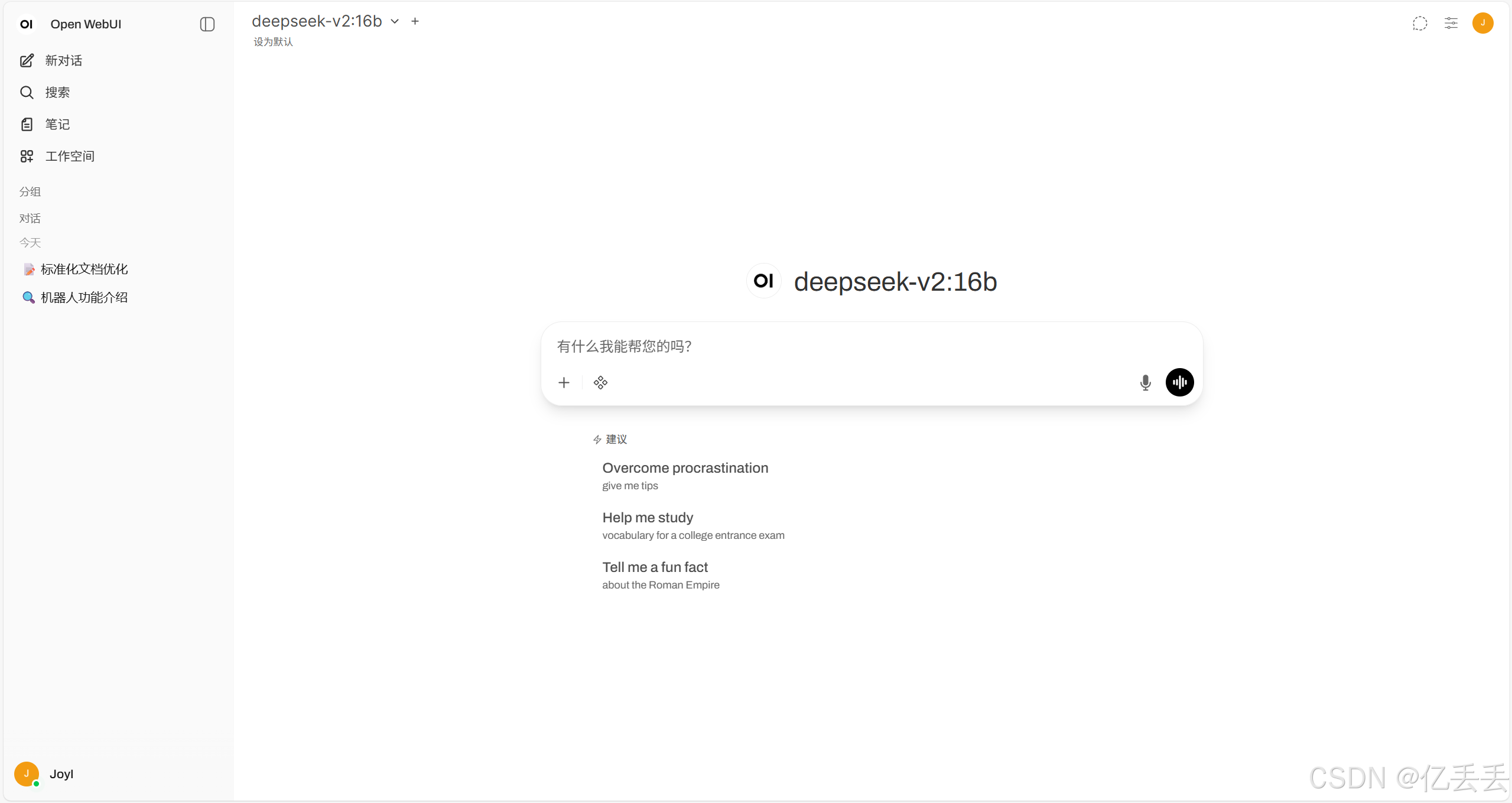 Ollama负责加载和管理DeepSeek模型。Open WebUI负责提供一个友好的Web界面。当你在Web界面中输入问题时,Open WebUI会通过Ollama的API(http://host.docker.internal:11434)将请求发送给Ollama,Ollama调用模型生成回答,然后返回给Open WebUI显示。