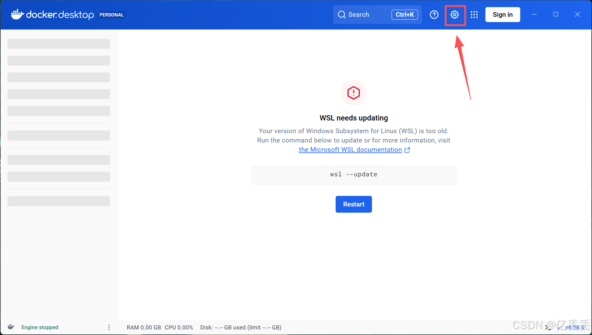 进入Docker Desktop主界面后,点击右上角的齿轮图标(Settings)