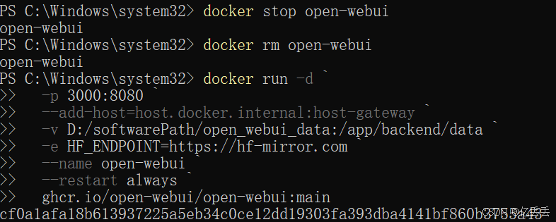 以 管理员身份 打开 PowerShell,然后执行以下这条完整的命令(open_webui_data数据存储位置可以改为自己的):