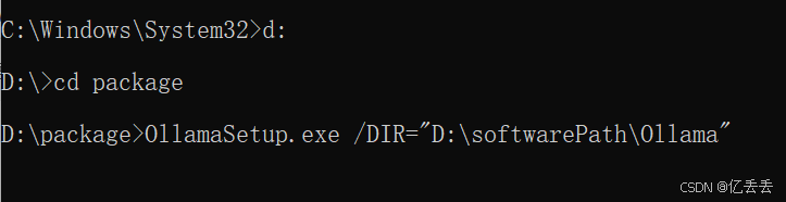 (1)管理员身份运行cmd,我的安装包所在目录为:D:\package,先进入到Ollama安装包所在目录,执行如下命令: