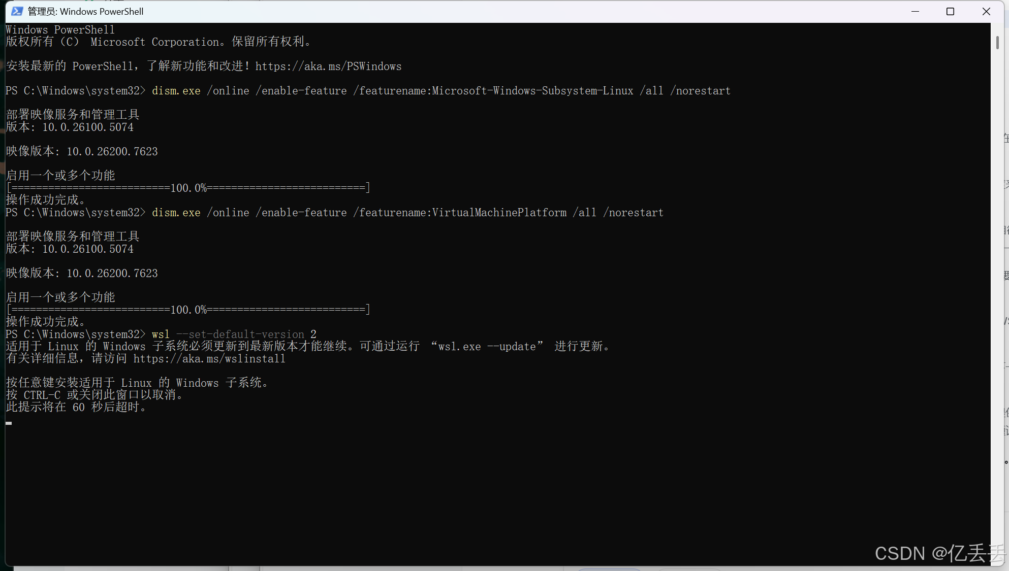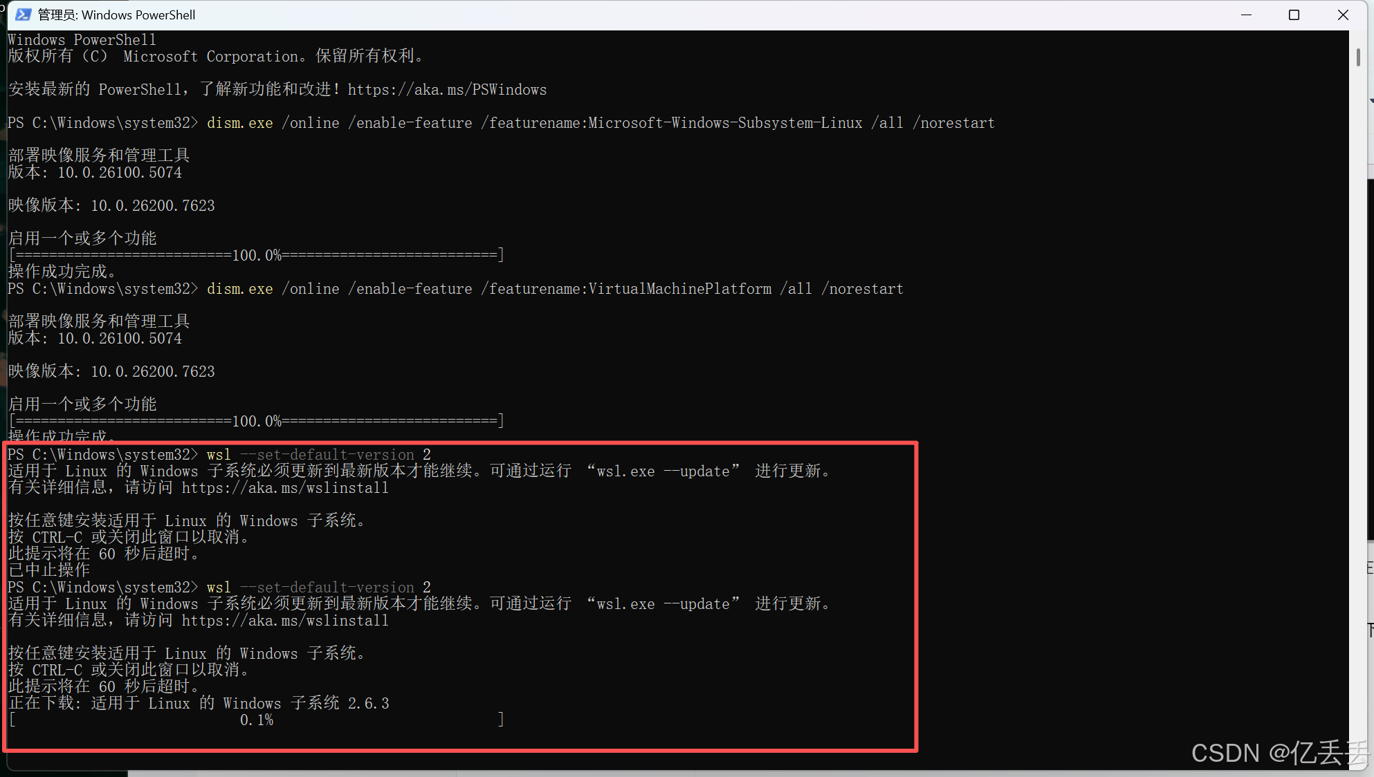 执行第三句时提示:WSL(Windows 子系统 for Linux)版本太旧了,在将其设为默认版本(WSL 2)之前,必须先更新其核心组件。